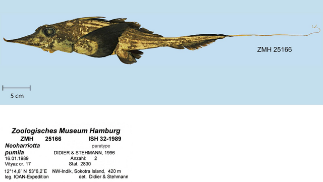矮新吻银鲛 作者: 发布: 2025年11月22日 2阅读 0评论 矮新吻银鲛又名阿拉伯镰鳍银鲛 学名:Neoharriotta pumila Neoharriotta pumila,picture by Leibniz Institute for the Analysis of Biodiversity Change (LIB). 分布:分布于索马里、也门以及可能还有印度附近海域。 形态:体长可达72.8 厘米。 特性:卵生,深海底栖,深度范围:375 – 380 米 站点部分内容来自网络,不代表鱼类网立场。https://www.yuleiwang.com/archives/1299